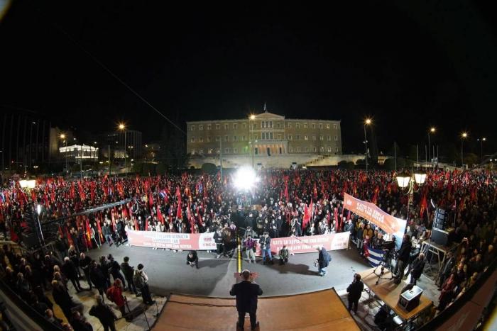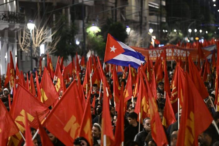 Miles de manifestantes, respondiendo al llamado del KKE, se reunieron en la icónica Plaza Syntagma de Atenas, frente al Parlamento Helénico, para rechazar las amenazas y políticas agresivas del imperialismo norteamericano contra Cuba.
