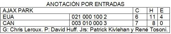 Los norteamericanos ganaban con pizarra de 6-4—jugando bajo la regla Schiller—, cuando los canadienses, con un out, marcaron una por texas de Pete Orr al central que impulsó una y llevó a un corredor a tercera y anotó la del gane cuando el relevista zurdo David Huff cometió error en viraje a primera y el jardinero derecho le abrió las puertas a la carreras de la victoria con un tiro errado.
