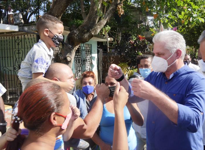 Acompañado por el secretario de Organización y Política de Cuadros, Roberto Morales Ojeda; el vice primer ministro y titular de Economía y Planificación, Alejandro Gil Fernández; y el coordinador nacional de los Comités de Defensa de la Revolución, Gerardo Hernández Nordelo, el mandatario cubano dialogó, con los vecinos y caminó –bajo una «lluvia» de vítores y frases de compromiso– una de las arterias donde aún se remueven las piedras de las primeras inversiones realizadas para saldar la añeja deuda del drenaje de fosas en la comunidad.