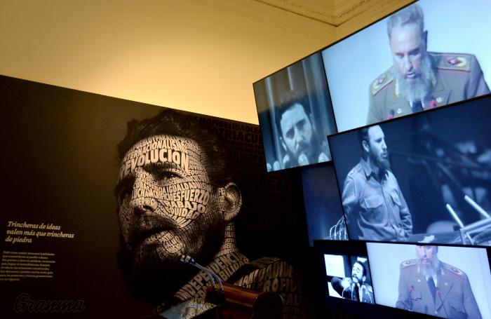 Al apagarse las luces, de las paredes surgen voces, rostros, palabras… Son pequeñas cápsulas de videos que recogen impresiones de personas que hablan de Fidel, de su obra, de lo que significó para ellos, de cuánto caló en el alma de la gente.