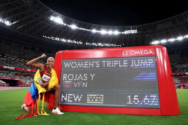 Yulimar Rojas, de Venezuela, se convirtió en campeona olímpica del triple salto en su primer intento con 15.41 metros. Nadie se le acercó.